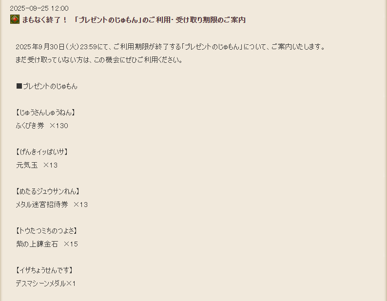 2025年9月30日(火)23:59にて、ご利用期限が終了する「プレゼントのじゅもん」