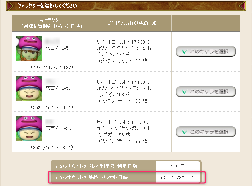 「目覚めし冒険者の広場」のキャラクター選択画面で各キャラクターの中断日時がでているようです。