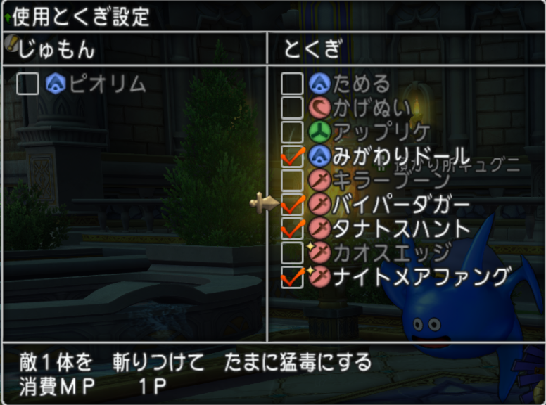 使用とくぎなんですけどね、バイパーダガー(たまに猛毒にする)とかナイトメアファングって