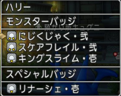 キングスライムバッジはですね、サポ魔剣士が死んだ時用に近接のザオ係としてつけました。